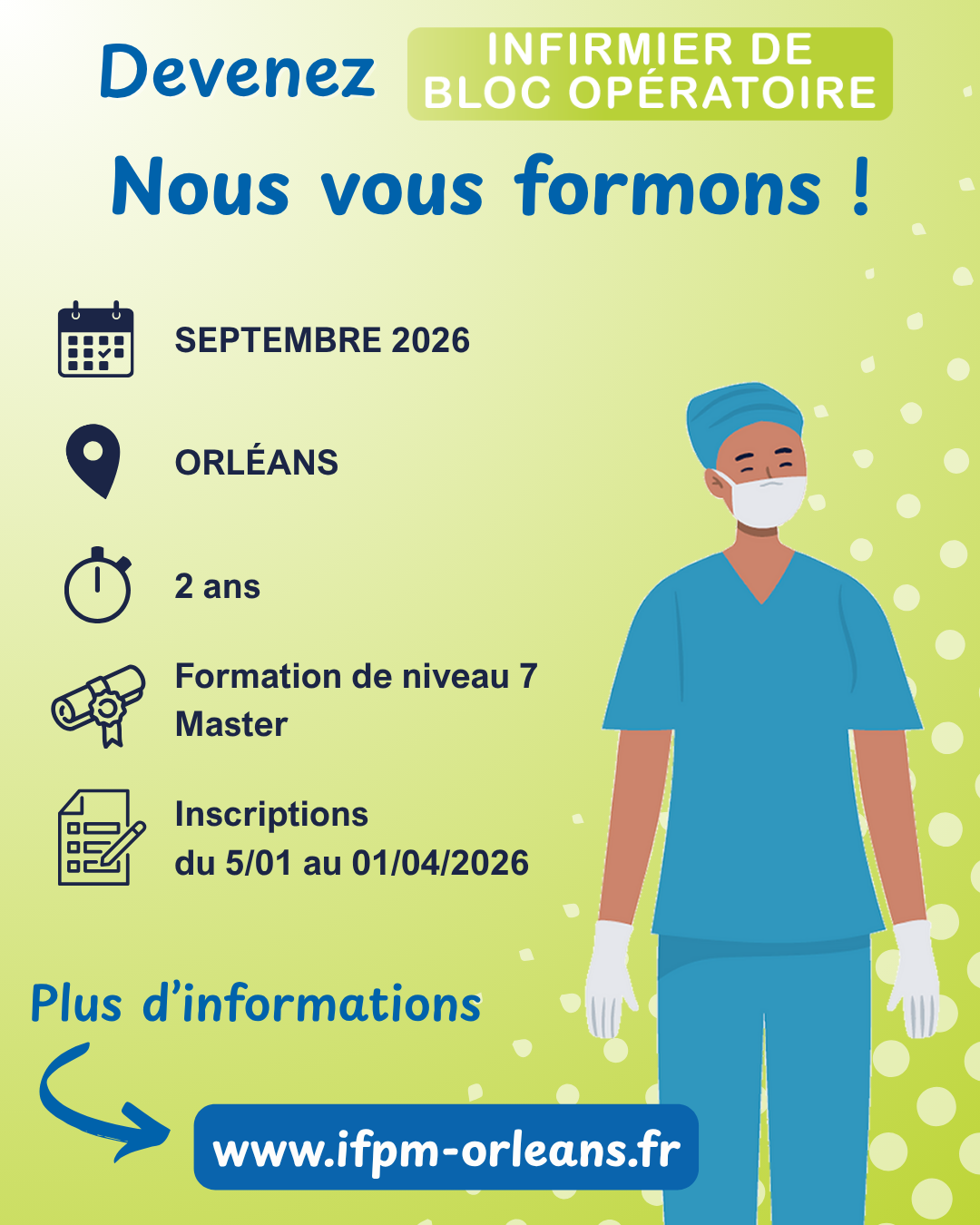 L’IFPM d’Orléans vous accompagne pour développer vos compétences spécifiques au bloc opératoire. Depuis l’arrêt du 27 avril 2022, la formation s’organise sur 2 ans (4 semestres) avec 33 semaines de formation en institut et 47 semaines de formation en milieu professionnel. Les inscriptions au processus de sélection pour une entrée en formation en septembre 2026 sont ouvertes du 05/01 au 01/04/2026.